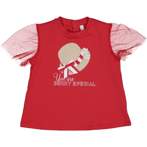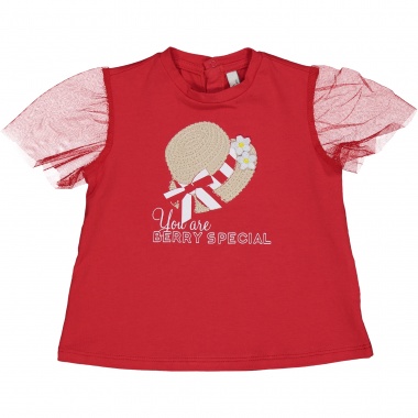 βαμβακερή μπλούζα της εταιρείας BIRBA σε κόκκινο χρώμα με στάμπα στο μπροστινό μέρος της μπλούζας και τούλι στα μανίκια, ιταλικής προέλευσης