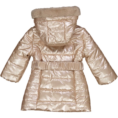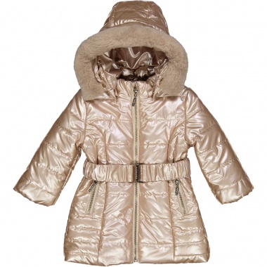 Φουσκωτό μακρύ μπουφάν της εταιρείας BIRBA σε χρυσό χρώμα με αποσπώμενη κουκούλα, τσέπες, ζώνη στο ίδιο χρώμα, αποσπώμενη γούνα στην κουκούλα, ιταλικής προέλευσης