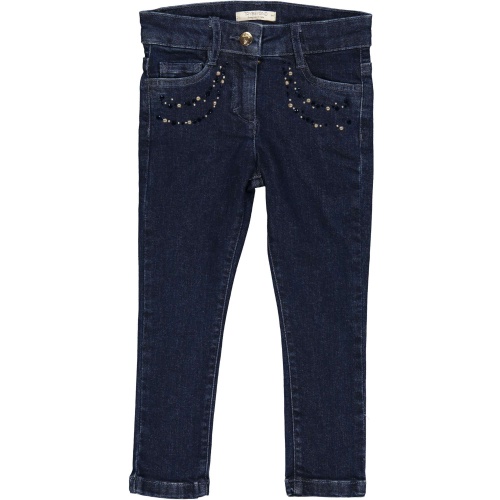 Βαμβακερό παντελόνι της εταιρείας TRYBEYOND, σε σκούρο denim χρώμα με στρασάκια στις τσέπες, ιταλικής προέλευσης